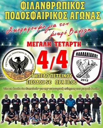 Αντιμέτωπες για καλό σκοπό θα βρεθούν οι ομάδες του Παλλαλιακού και των επίλεκτων του συλλόγου Ποντίων νομού Ξάνθης, τη Μεγάλη Τετάρτη 4 Απριλίου 2018, στις 6 το απόγευμα στο γήπεδο του Πετεινού.