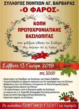 Την κοπή της πρωτοχρονιάτικης βασιλόπιτας θα πραγματοποιήσει ο σύλλογος Ποντίων Αγίας Βαρβάρας «Ο ΦΑΡΟΣ», το Σάββατο 13 Ιανουαρίου 2018, στις 8 το βράδυ στην αίθουσα του συλλόγου (Μεγ. Αλεξάνδδρου 169, Αγία Βαρβάρα».