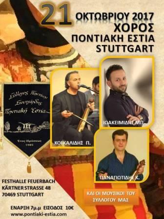 Τον ετήσιο χορό του διοργανώνει ο σύλλογος Ποντίων Στουτγάρδης «Ποντιακή Εστία», και προσκαλεί τα μέλη και τους φίλους να παρευρεθούν και να ανταμώσουν όλοι, γλεντώντας στους ήχους της λύρας και του νταουλιού.