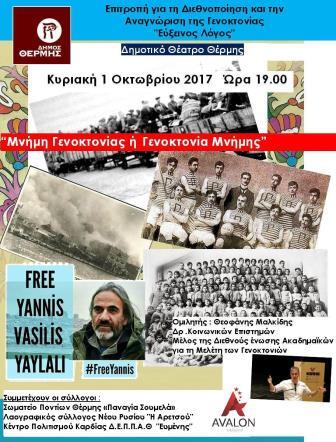 Εκδήλωση με θέμα «Μνήμη Γενοκτονίας ή Γενοκτονία Μνήμης», πραγματοποιεί ο δήμος Θέρμης και η Επιτροπή για τη Διεθνοποίηση και την Αναγνώριση της Γενοκτονίας «Εύξεινος Λόγος» την Κυριακή 1 Οκτωβρίου 2017, στις 19.00, στο δημοτικό Θέατρο Θέρμης.