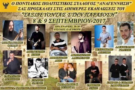 Διήμερες πολιτιστικές εκδηλώσεις πραγματοποιεί ο Ποντιακός Πολιτιστικός Σύλλογος «Αναγέννηση» Δενδροποτάμου με γενικό τίτλο «Ταξιδεύοντας Στην Παράδοση» την Παρασκευή 8 και το Σάββατο 9 Σεπτεμβρίου 2017, στον αύλειο χώρο του 5ου Δημοτικού Σχολείου Μενεμένης στον Δενδροπόταμο.