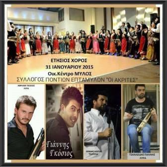 Το Σάββατο 31 Ιανουαρίου 2015 θα πραγματοποιηθεί ο ετήσιος χορός του συλλόγου Ποντίων Επταμύλων Σερρών «ΟΙ ΑΚΡΙΤΕΣ στο οικογενειακό κέντρο «Μύλος» στην Οινούσα Σερρών, με ώρα έναρξης στις 20:30 το βράδυ.