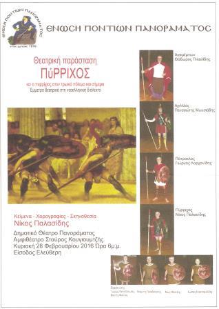 Ένα ποίημα 560 στίχων του πυρριχιστή Νίκου Κ. Παλασίδη, για τον Πυρρίχιο χορό στον τρωικό πόλεμο και σήμερα (έμμετρο θεατρικό στη νεοελληνική διάλεκτο), θα κάνει πρεμιέρα στο δημοτικό θέατρο Πανοράματος (αμφιθέατρο Σταύρος Κουγιουμτζής) την Κυριακή 28 Φεβρουαρίου 2016 στις 6 το απόγευμα, με πρωτοβουλία της Ένωσης Ποντίων Πανοράματος.