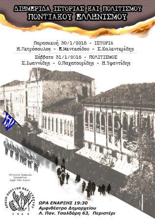 Διημερίδα για την ιστορία και τον πολιτισμό του ποντιακού ελληνισμού θα πραγματοποιηθεί την Παρασκευή 30 και το Σάββατο 31 Ιανουαρίου 2015 από την Ένωση Ποντίων Περιστερίου Αττικής στο αμφιθέατρο του δημαρχείου (Λ. Παν. Τσαλδάρη 63).