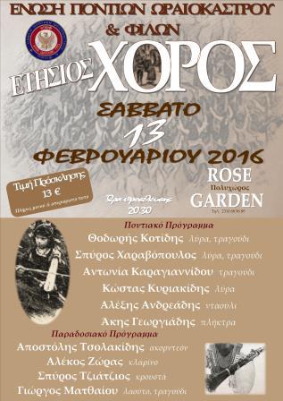 Τον ετήσιο χορό της πραγματοποιεί η Ένωση Ποντίων Ωραιοκάστρου και Φίλων το Σάββατο 13 Φεβρουαρίου 2016 στον πολυχώρο ROSEGARDEN στο Παλαιόκαστρο.