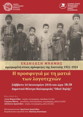 Εκδήλωση μνήμης αφιερωμένη στους πρόσφυγες της Ανατολής – 1922 – 1924, διοργανώνουν το Ιστορικό Αρχείο Προσφυγικού Ελληνισμού του δήμου Καλαμαριάς και η Ένωση Λογοτεχνών Βορείου Ελλάδος.