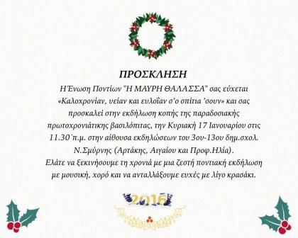 Η κοπή της πρωτοχρονιάτικης βασιλόπιτας θα γίνει την Κυριακή 17 Ιανουαρίου 2016 στην Ένωση Ποντίων «Η ΜΑΥΡΗ ΘΑΛΑΣΣΑ» στην αίθουσα εκδηλώσεων του 3ου – 13 ου δημοτικού σχολείου Νέας Σμύρνης (Αρτάκης, Αιγαίου και Προφ. Ηλία).