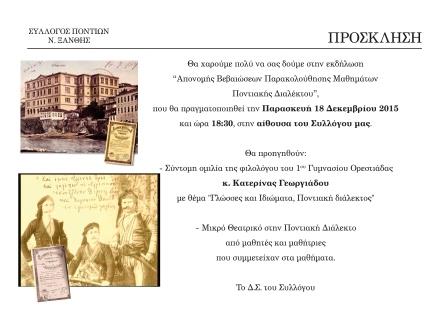 Εκδήλωση πραγματοποιεί ο σύλλογος Ποντίων νομού Ξάνθης, προκειμένου να γίνει η «Απονομή βεβαιώσεων παρακολούθησης μαθημάτων Ποντιακής Διαλέκτου», η οποία θα γίνει την Παρασκευή 18 Δεκεμβρίου 2015 στις 18:30 μ.μ. στην αίθουσα του Συλλόγου.