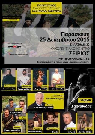 Τον Χριστουγεννιάτικο χορό του διοργανώνει ο πολιτιστικός σύλλογος Πατρίδας «Ευστάθιος Χωραφάς», την Παρασκευή 25 Δεκεμβρίου 2015 στις 20.30 στο οικογενειακό κέντρο «ΣΕΙΡΙΟΣ».