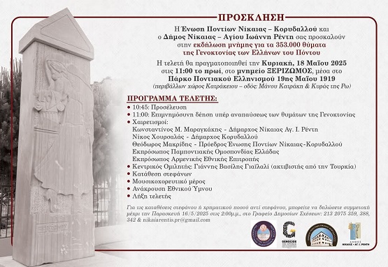 Εκδήλωση μνήμης για τα 353.000 θύματα της Γενοκτονίας του Ποντιακού Ελληνισμού, διοργανώνουν η Ένωση Ποντίων Νίκαιας – Κορυδαλλύ και ο Δήμος Νίκαιας Αγ. Ιωάννη Ρέντη το πρωί της Κυριακής 18 Μαΐου 2025, με κεντρικό ομιλητή τον Γιάννη Βασίλη Γιαϊλαλί, ακτιβιστή από την Τουρκία, απόγονο Ελλήνων εξισλασμισμένων της Τουρκίας.
