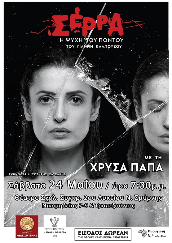 Αυτό το Σαββατοκύριακο έχουμε την ιδιαίτερη χαρά να σας προσκαλέσουμε στο διήμερο αφιέρωμα που συνδιοργανώνουμε με το δήμο Ν. Σμύρνης, που μας δίνει τη δυνατότητα να "φέρουμε" αυτό το Σάββατο 24/5 τη συγκλονιστική παράσταση "Σέρρα η ψυχή του Πόντου".