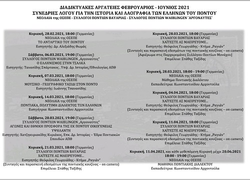Διαδικτυακές αργατείες συνεδρίες λόγου για την ιστορία και λαογραφία των Ελλήνων του Πόντου, που αρχίζουν την Κυριακή 28 Φεβρουαρίου και λήγουν την Κυριακή 11 Απριλίου 2021, διοργανώνουν η νεολαία της Ομοσπονδίας Συλλόγων Ελλήνων Ποντίων στην Ευρώπη (ΟΣΕΠΕ), οι σύλλογοι Ποντίων Βαυαρίας και ο σύλλογος Ποντίων Βαΐμπλινγεν «Αργοναύτες».