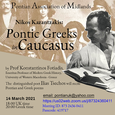 Η Ένωση Ποντίων Κεντρικής Αγγλίας προσκαλέσει όλους τους κατοίκους του Ηνωμένου Βασιλείου, στη διαδικτυακή εκδήλωση την Κυριακή 14 Μαρτίου 2021, με ομιλητή τον Ομότιμο Καθηγητή Νεότερης Ιστορίας του Πανεπιστημίου Δυτικής Μακεδονίας Κωνσταντίνο Φωτιάδη με τιτλο: «Καζαντζάκης - Πόντιοι του Καυκάσου».