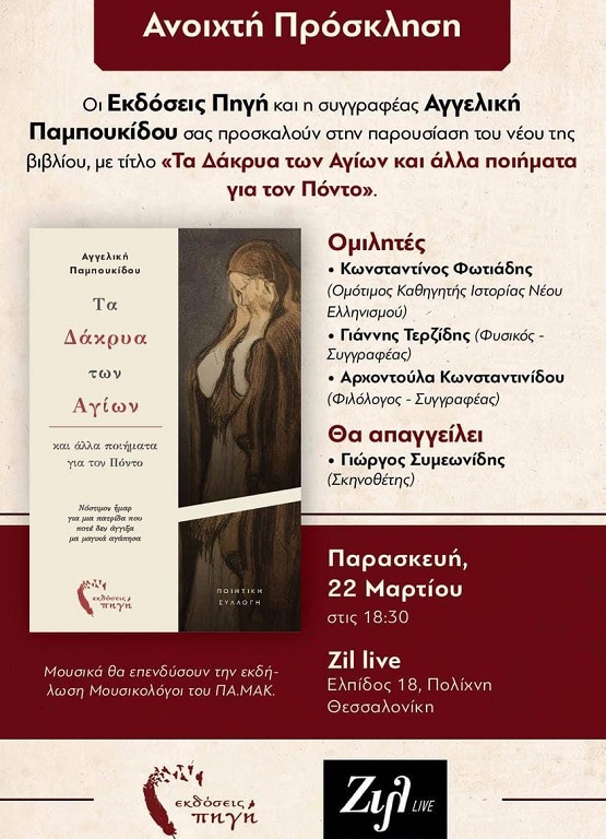 Η πρώτη επίσημη βιβλιοπαρουσίαση της Ποιητικής Συλλογής της Αγγελικής Παμπουκίδου «Τα Δάκρυα των Αγίων και άλλα ποιήματα για τον Πόντο», που εξέδωσαν οι Πρότυπες Εκδόσεις Πηγή, θα πραγματοποιηθεί την Παρασκευή 22 Μαρτίου 2024 και ώρα 18.30, στο κέντρο Zil live, στην Πολίχνη Θεσσαλονίκης, οδός Ελπίδος 18.