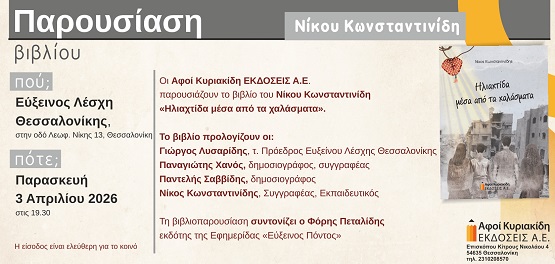 Το νέο βιβλίο του εκπαιδευτικού και συγγραφέα Νίκου Κωνσταντινίδη «’Ηλιαχτίδα μέσα από τα χαλάσματα», παρουσιάζουν από τον εκδοτικό οίκο Αφοί Κυριακίδη Εκδόσεις Α.Ε., την Παρασκευή 3 Απριλίου 2026, στις 19.30 το βράδυ, στην Εύξεινο Λέσχη Θεσσαλονίκης (Λεωφ. Νίκης 13) στο κέντρο της πόλης με ελεύθερη είσοδο για το κοινό.