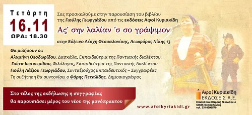 Το βιβλίο της Γιούλης Γ. Γεωργιάδου - Λάζιου, συνταξιούχου εκπαιδευτικού «Ασ’ σην λαλίαν ‘ς σο γράψιμον», που εξέδωσαν οι Αφοί Κυριακίδη ΕΚΔΟΣΕΙΣ Α.Ε., θα παρουσιαστεί στην Εύξεινο Λέσχη Θεσσαλονίκης (Λεωφ. Νίκης 13), την Τετάρτη 16 Νοεμβρίου 2022, και ώρα 18.30.