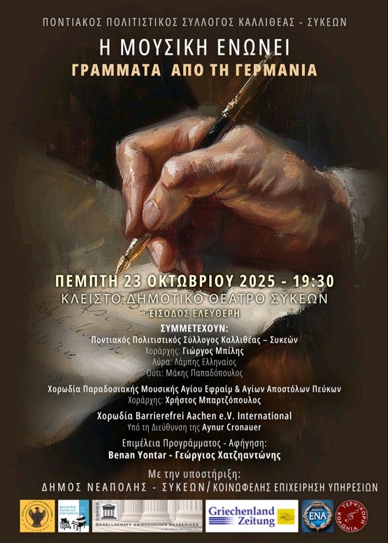 Ο Ποντιακός Πολιτιστικός Σύλλογος Καλλιθέας Συκεών σας προκαλεί στην εκδήλωση: «Η ΜΟΥΣΙΚΗ ΕΝΩΝΕΙ» «ΓΡΑΜΜΑΤΑ ΑΠΟ ΤΗ ΓΕΡΜΑΝΙΑ» Πέμπτη 23 Οκτωβρίου 2025 και ώρα: 19:30 στο ΚΛΕΙΣΤΌ ΔΗΜΟΤΙΚΟ ΘΕΑΤΡΟ ΣΥΚΕΩΝ.