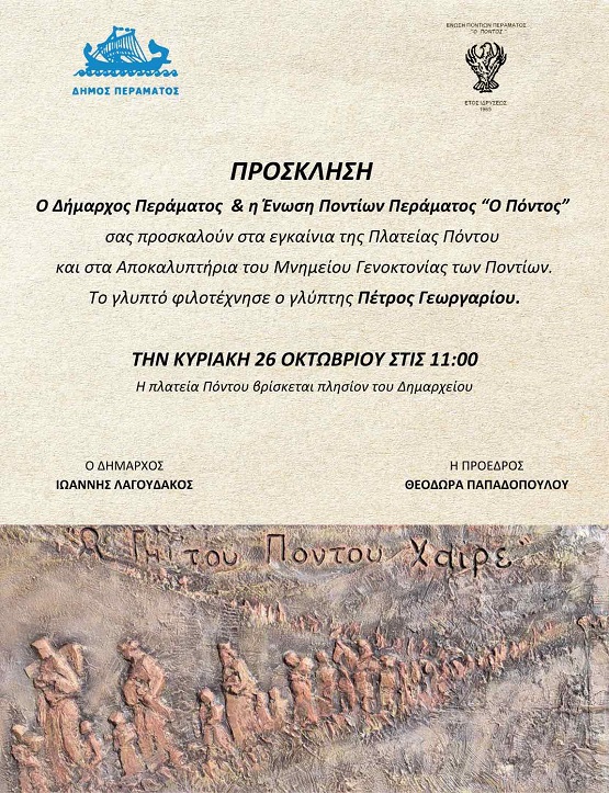 Η τελετή των εγκαινίων της πλατείας Ποντίων και τα αποκαλυπτήρια του μνημείου την Κυριακή 26 Οκτωβρίου, συνδιοργανώνονται από τον Δήμο Περάματος και την Ένωση Ποντίων Περάματος «Ο Πόντος» και ανοίγουν τον κύκλο εορτασμού του τριημέρου της 28ης Οκτωβρίου που ετοιμάζεται με λαμπρότητα από τη δημοτική αρχή.