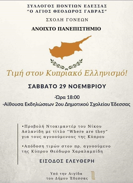 Το ντοκιμαντέρ που διερευνά την τύχη των αγνοουμένων, 51 χρόνια μετά την εισβολή των Τούρκων στην Κύπρο, θα προβληθεί στις 18.00, στην αίθουσα εκδηλώσεων του 2ου δημοτικού σχολείου Έδεσσας.