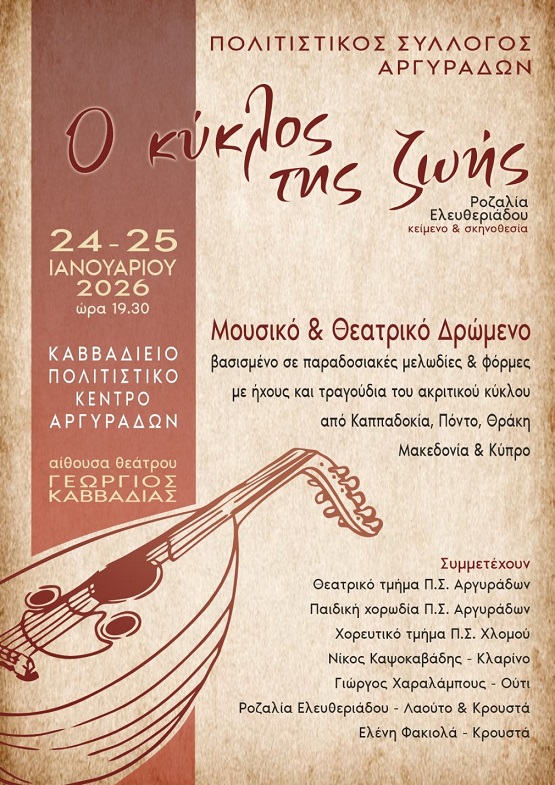Ένα μουσικό και θεατρικό δρώμενο με γενικό τίτλο «Ο Κύκλος της Ζωής», σε κείμενο και σκηνοθεσία της Ροζαλίας Ελευθεριάδου, θα παρουσιαστεί το Σάββατο 24 και την Κυριακή 25 Ιανουαρίου 2026, από τον Πολιτιστικό Σύλλογο Αργυράδων Κέρκυρας, στο Καββαδίειο Πολιτιστικό Κέντρο Αργυράδων, στην αίθουσα θεάτρου Γεώργιος Καββαδίας, με ώρα έναρξης στις 19.30.