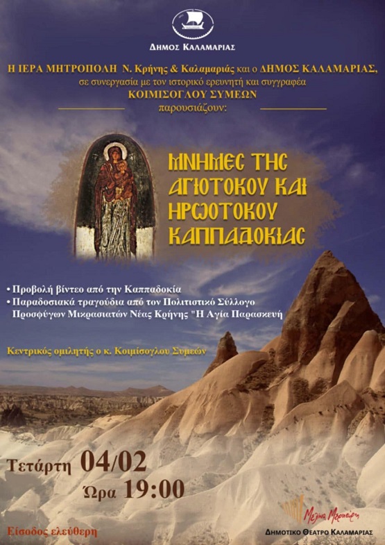 Η εκδήλωση με τίτλο «Μνήμες της Αγιοτόκου και Ηρωοτόκου Καππαδοκίας» θα πραγματοποιηθεί την Τετάρτη 4 Φεβρουαρίου στις 7 μ.μ. στο Δημοτικό Θέατρο Καλαμαριάς «Μελίνα Μερκούρη».