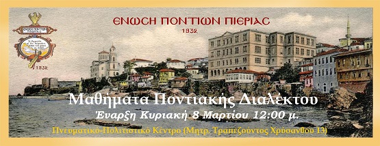 Μαθήματα ποντιακής διαλέκτου διοργανώνει η Ένωση Ποντίων Πιερίας, και η έναρξή του θα γίνει την Κυριακή 8 Μαρτίου 2026, στις 12 το μεσημέρι, στο Πνευματικό -Πολιτιστικό Κέντρο της Ένωσης Ποντίων Πιερίας, με την Αναστασία Μαχαιρίδου, Φιλόλογος – Γλωσσολόγο, Διαπιστευμένη Εκπαιδεύτρια της Ποντιακής και οι ενδιαφερόμενοι μπορούν να τα παρακολουθήσουν δωρεάν.
