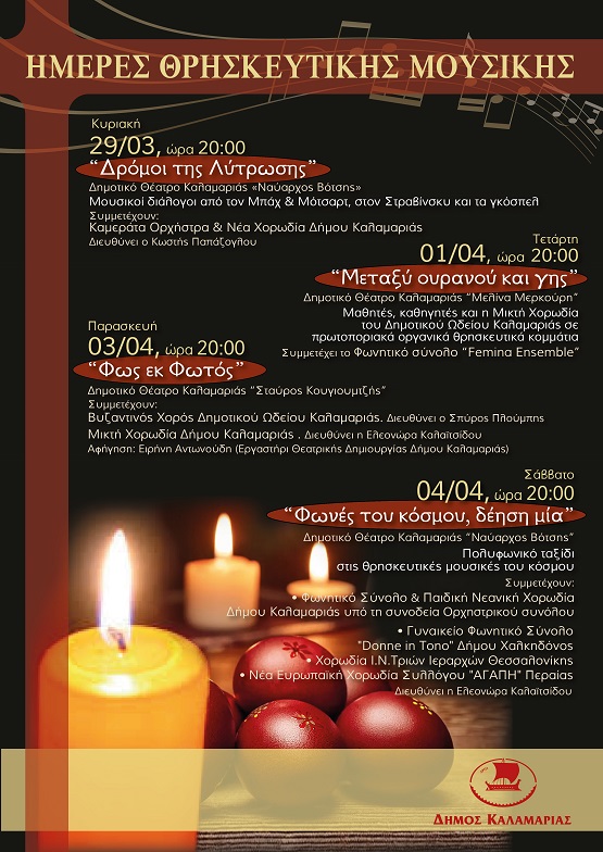 Μαθητές, καθηγητές και η Μικτή Χορωδία του Δημοτικού Ωδείου Καλαμαριάς παρουσιάζουν πρωτότυπα οργανικά θρησκευτικά έργα. Συμμετέχει το φωνητικό σύνολο “Femina Ensemble”.