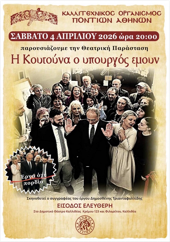 Την Θεατρική Παράσταση, «Η κουτούνα ο υπουργός εμουν», παρουσιάζει ο Καλλιτεχνικός Οργανισός Ποντίων Αθηνών (ΚΟΠΑ) το Σάββατο 4 Απριλίου 2026 και ώρα 20:00 στο Δημοτικό Θέατρο Καλλιθέας (Κρέμου 123 και Φιλαρέτου) στην Καλλιθέα με ελεύθερη είσοδο για το κοινό.