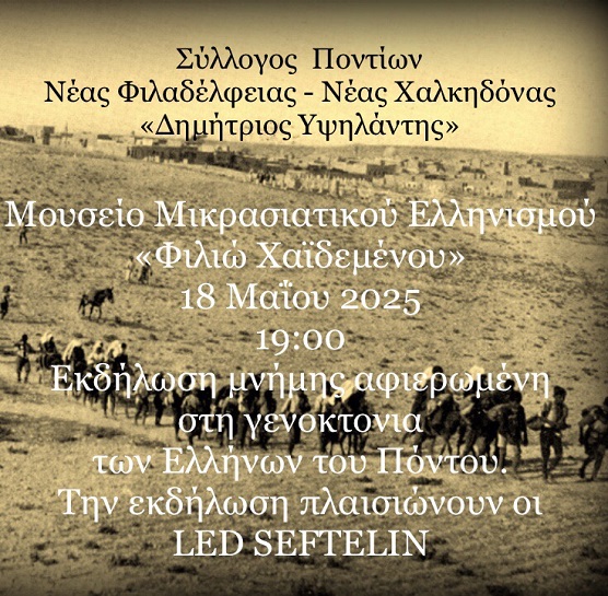 Εκδήλωση μνήμης για τη Γενοκτονία των Ελλήνων του Πόντου, πραγματοποιεί το βράδυ της Κυριακής 18 Μαΐου 2025, ο Σύλλογος Ποντίων Νέας Φιλαδέλφειας - Νέας Χαλκηδόνας “Δημήτριος Υψηλάντης”.
