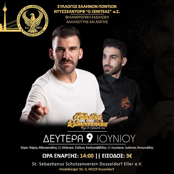 Συγκεκριμένα ο Σύλλογος Ελλήνων Ποντίων Ντύσσελντορφ «Ο Ξενιτέας» διοργανώνει την καθιερωμένη Φιλανθρωπική Εκδήλωση Αλληλεγγύης και Αγάπης, με τη συμμετοχή στο μουσικό πρόγραμμα των καλλιτεχνών από την Ελλάδα του Γαβρίλου Σιδηρόπουλου στο τραγούδι και στη λύρα του Χάρη Αθανασιάδη, στα πλήκτρα του Στέλιου Χατζησαββίδη και στα τύμπανα του Γιάννη Αντωνιάδη.