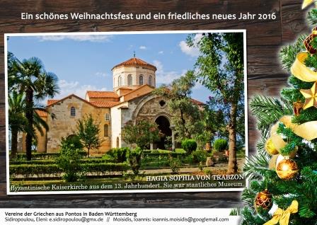 Ευρηματική και γεμάτη μηνύματα είναι η ευχετήρια κάρτα για τις γιορτές που δημιούργησαν και απέστειλαν προς τους βουλευτές, αλλά και τους εκπροσώπους φορέων της Γερμανίας, και κυρίως του κρατιδίου της Βάδης – Βυρτεμβέρης, η Ελένη Σιδηροπούλου και ο Ιωάννης Μωϊσίδης, εκ μέρους των ποντιακών συλλόγων της περιοχής.