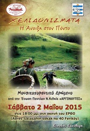 Το μουσικοχορευτικό δρώμενο «ΧΕΛΙΔΟΝΙΣΜΑΤΑ: Η Άνοιξη στον Πόντο», θα παρουσιάσει η Ένωση Ποντίων νομού Κιλκίς «ΟΙ ΑΡΓΟΝΑΥΤΕΣ» σε συνεργασία με τον Μορφωτικό και Καλλιτεχνικό Σύνδεσμο Φερίκιοϊ ΕΡ.Θ.Ο. στην Κωνσταντινούπολη.