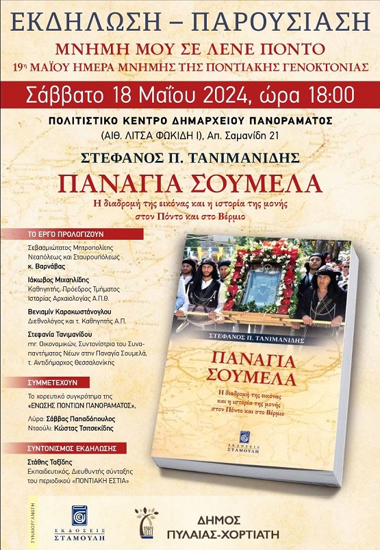 Την αυλαία των φετινών εκδηλώσεων Μνήμης για τη Γενοκτονία των Ελλήνων του Πόντου, ανοίγει η αντιδημαρχία Πολιτισμού και Τουρισμού του δήμου Πυλαίας – Χορτιάτη, σε συνδιοργάνωση με τις Εκδόσεις Σταμούλη, με την παρουσίαση του νέου βιβλίου του συγγραφέα Στέφανου Τανιμανίδη «Παναγία Σουμελά – Η διαδρομή της εικόνας και η ιστορία της μονής στον Πόντο και στο Βέρμιο».